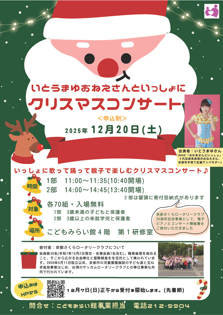 京都さくらロータリークラブ様からの寄付による、京都市子育て応援アンバサダーいとうまゆさんの楽しいクリスマスコンサート♪いっしょに歌って踊って楽しい時間を過ごしましょう。